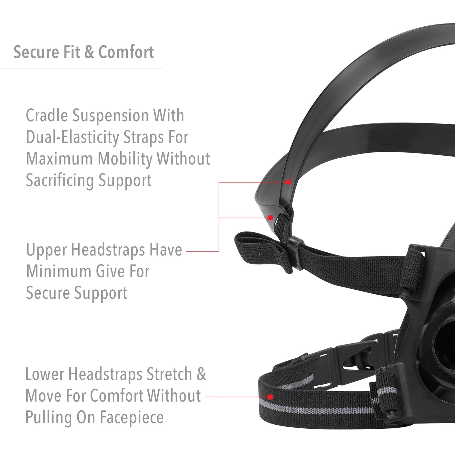 • Lower headstraps stretch and move with the worker for more comfort without pulling on the facepiece.