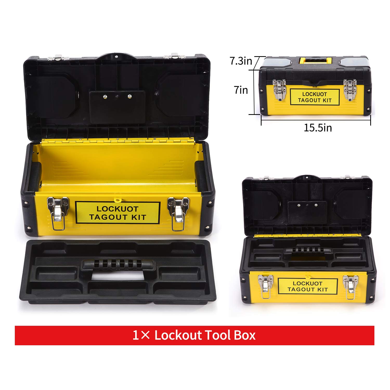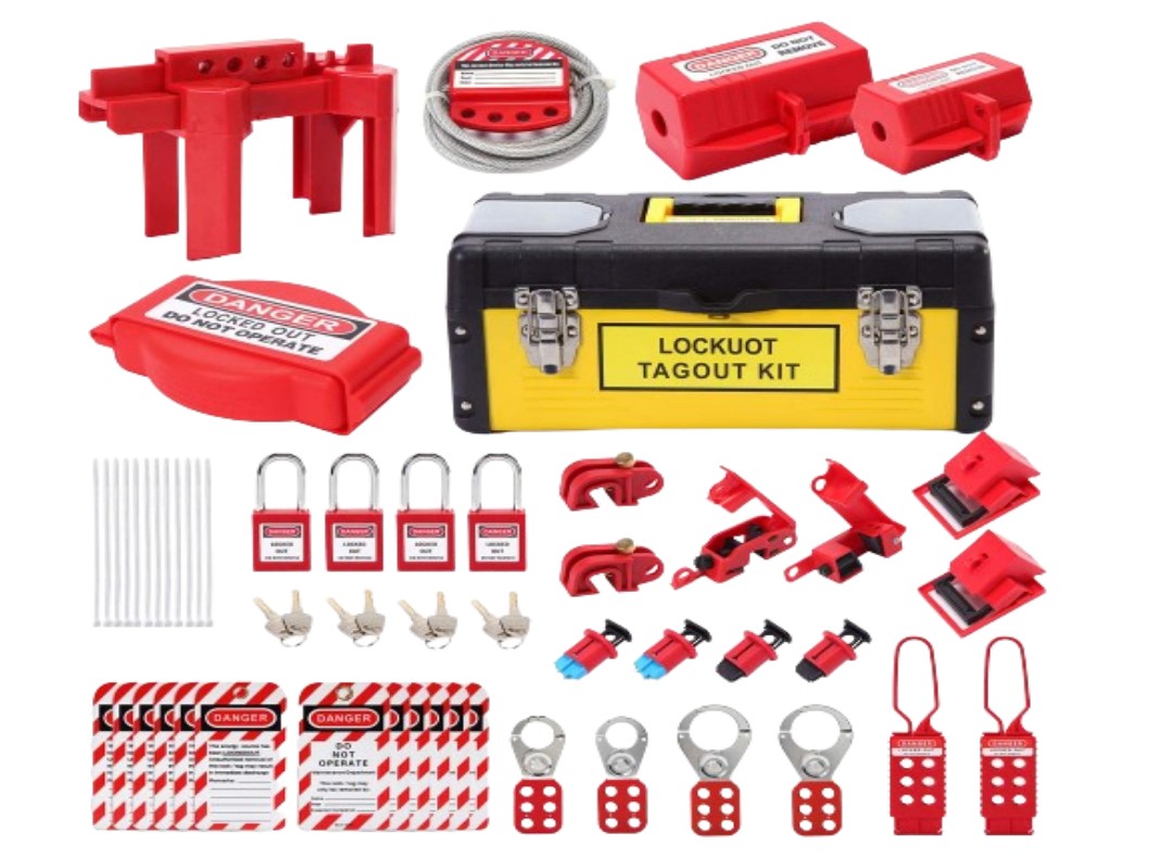 • Lockout tagout kit with 4 Safety Padlocks, 4 Lockout Hasp, 1 Ball Valve Lockout, 1 Steel Cable Lockout, 2 Electrical plug Lockout, 2 Nylon hasp, 1 Valve Lockout, 10 Different Types of Universal Circuit Breaker Lockout, 12 Loto Tags, 12 Nylon ties, 1 Lockout Tool Box.