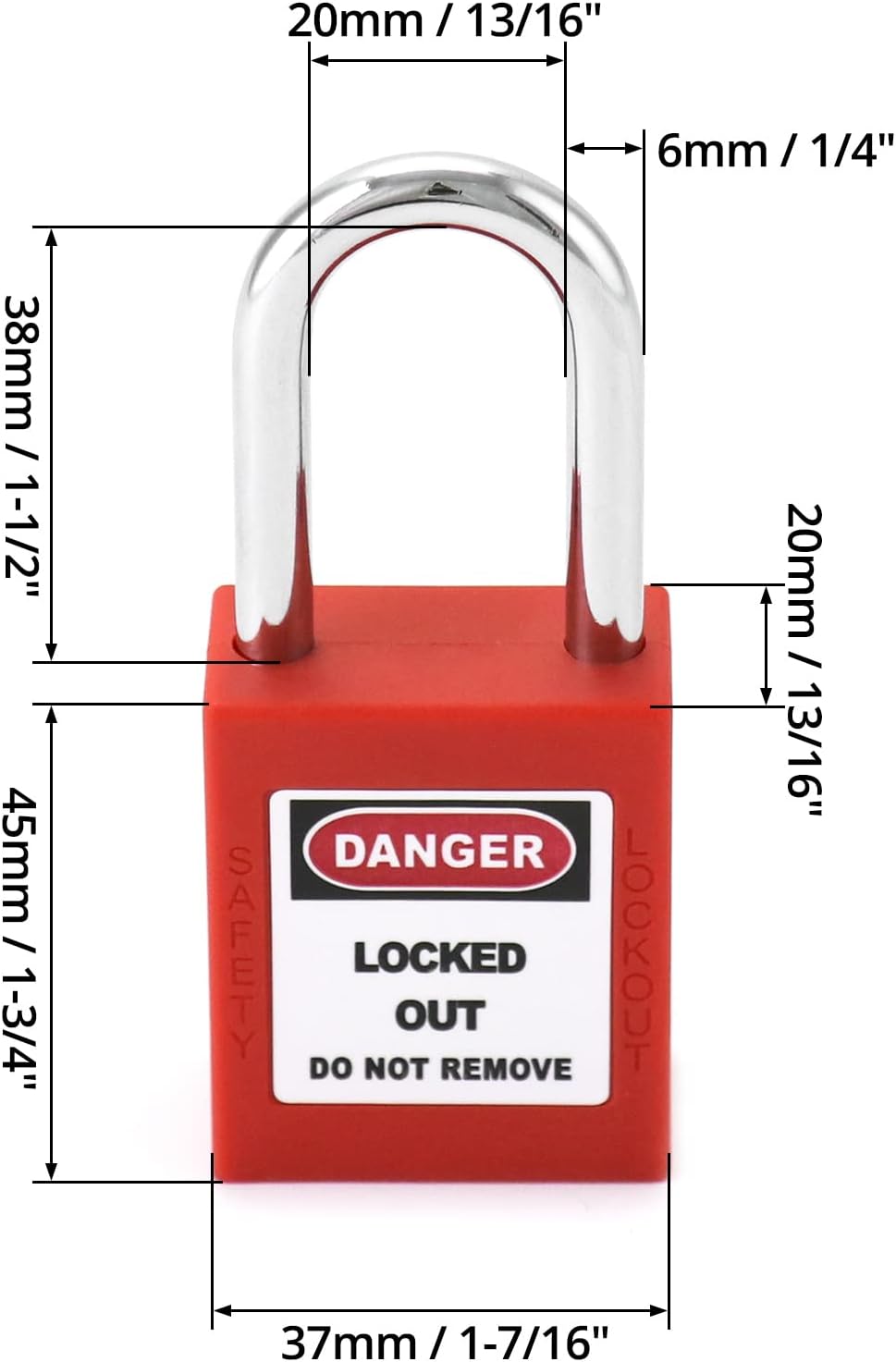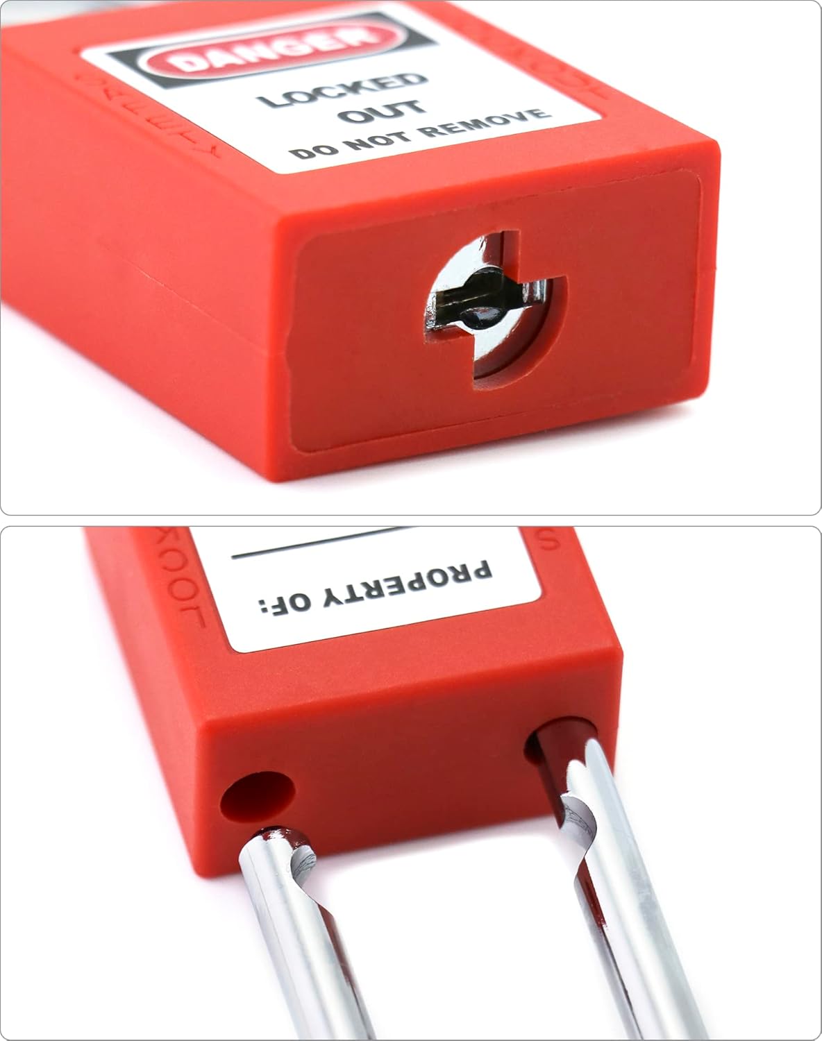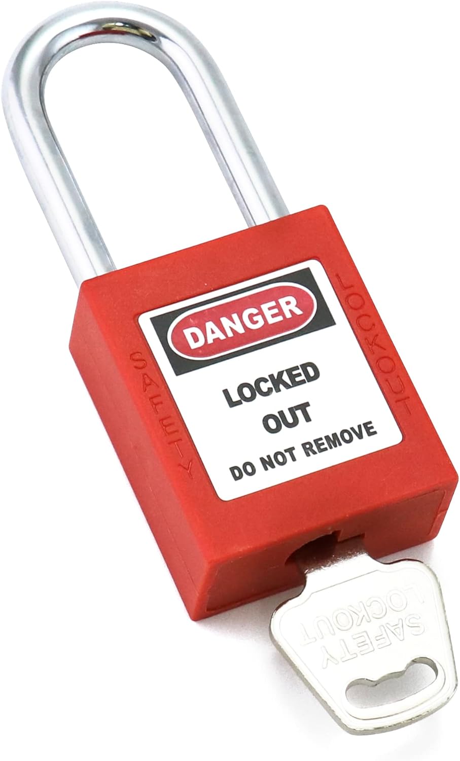 Composite safety padlock red with a (6mm) hardened steel shackle and key retaining function.